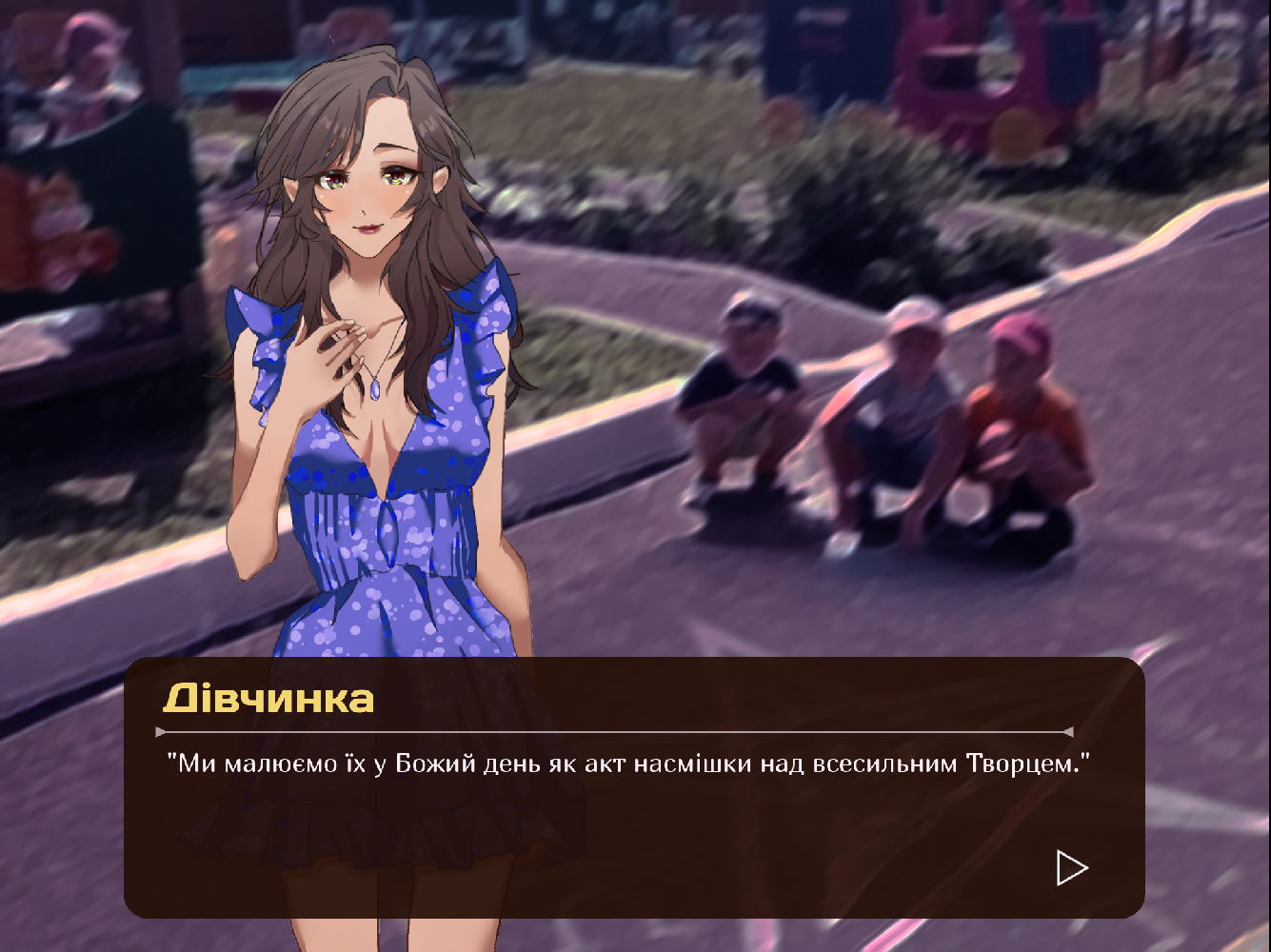 ❗️ Увага: гра містить описи сексу в громадських місцях, мастурбації, золотого дощу, оголеності, згадки самогубства, фантазій про вбивства й зґвалтування, релігії, нецензурну лексику й один звук вибуху. Також у грі присутня сцена [SPOILER] з обіймами вужа. Сцени з усіма вище зазначеними речами НЕ МАЮТЬ візуалізації.